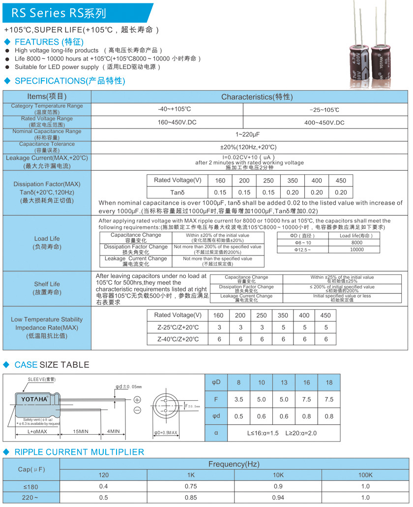 ● Life 10000 hours at +105°C(+105°C10000小時壽命)