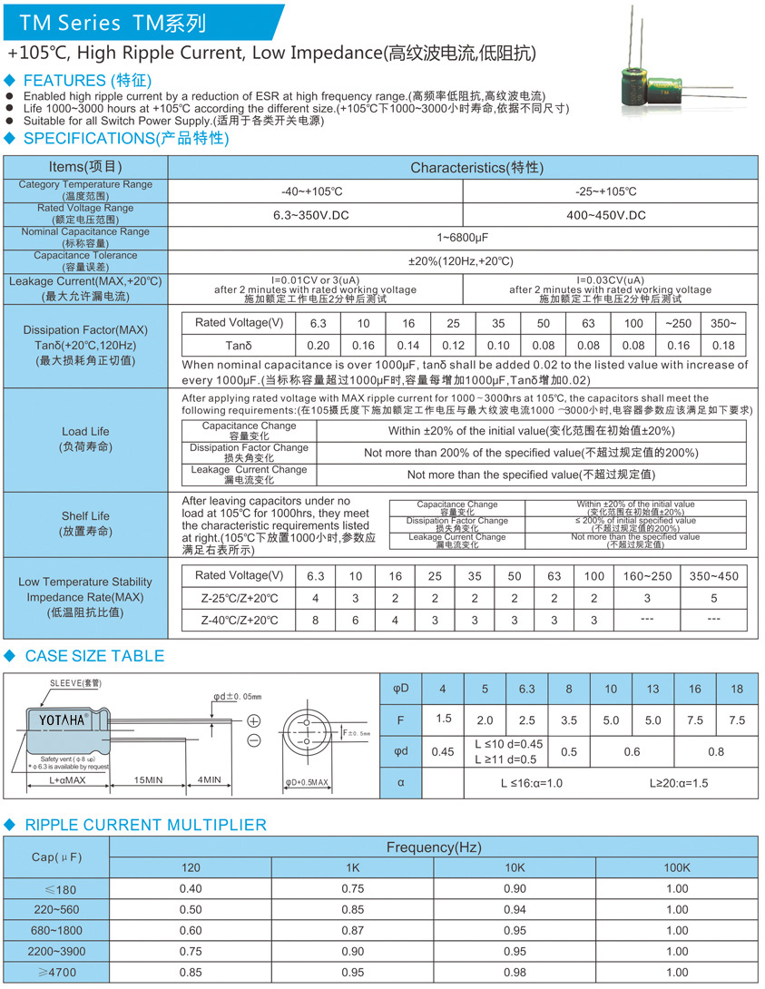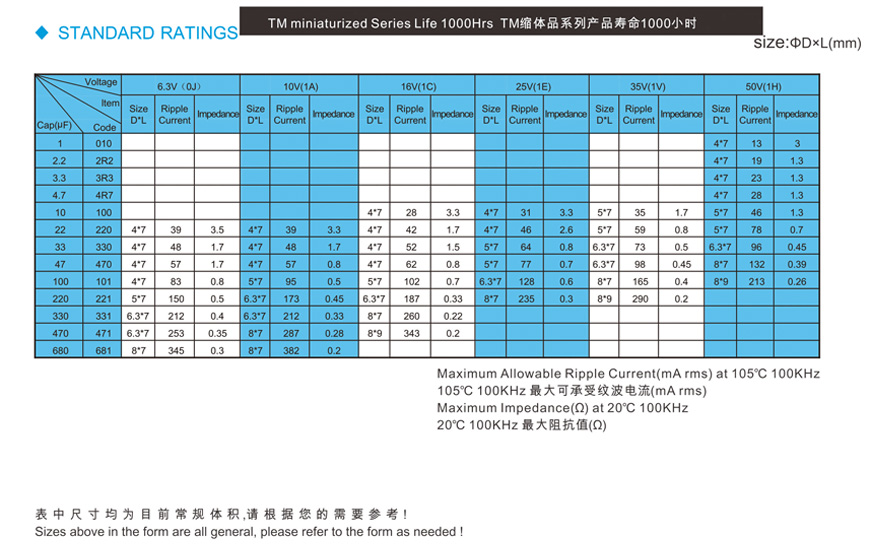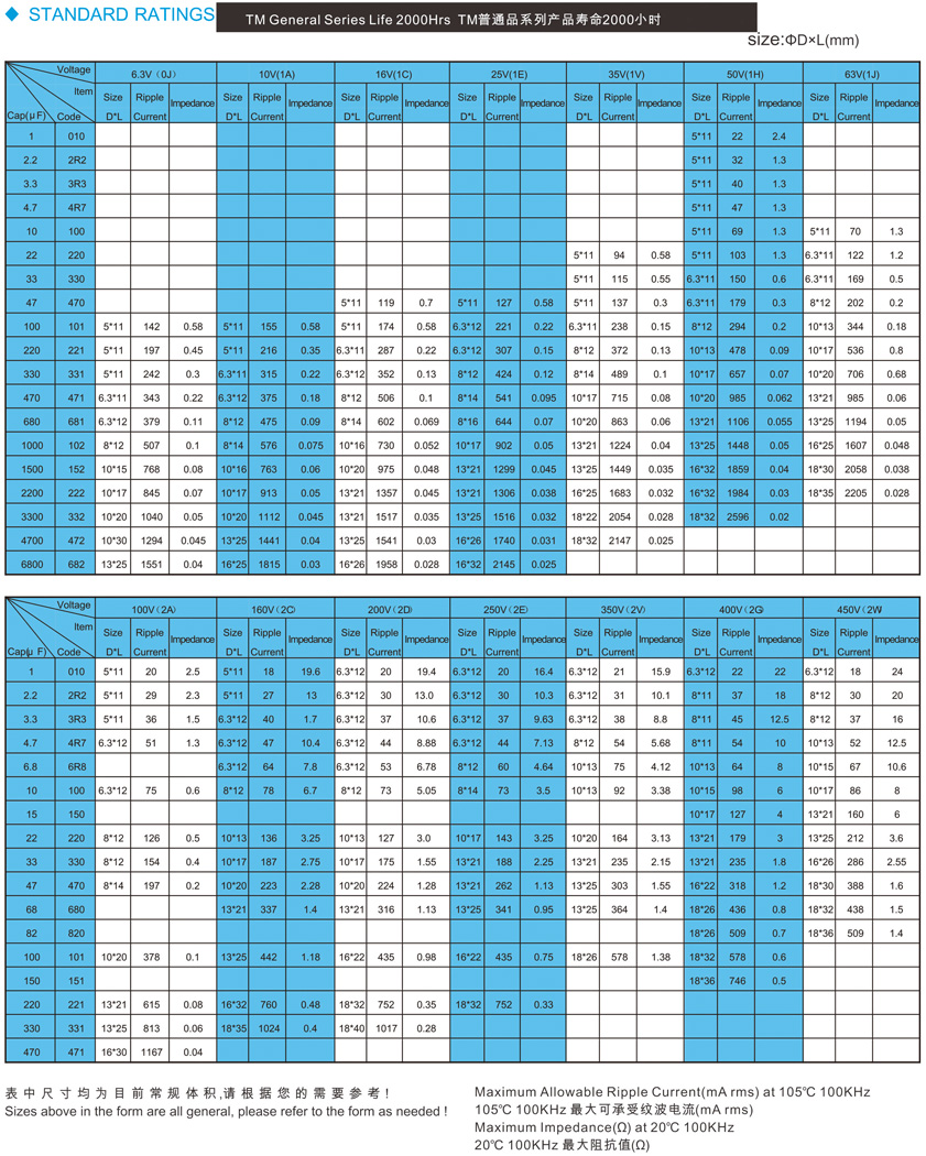 ● Life 1000-3000 hours at + 105°C according the diferent size.(+105°C下1000-3000小時壽命,依據(jù)不同尺寸)