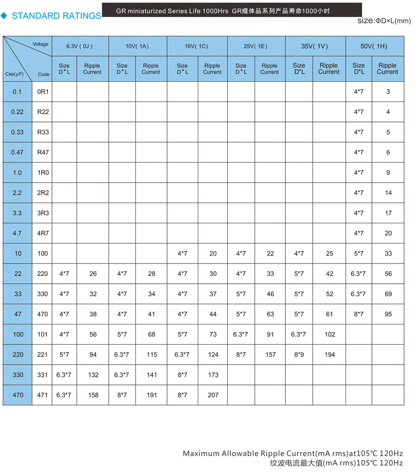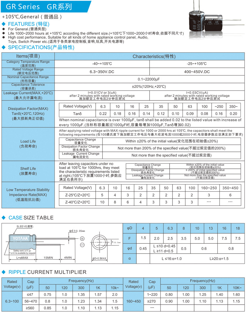 ● Life 1000~2000 hours at+105℃ according the different size.(+105℃下1000~2000小時(shí)壽命,依據(jù)不同尺寸)